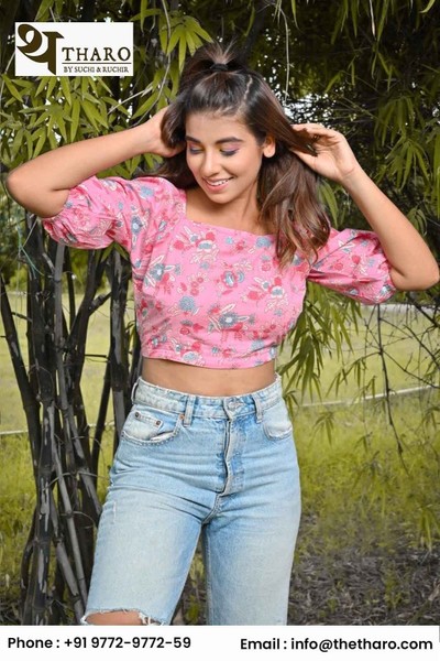 A floral cotton crop top is a short-length blouse made from lightweight and breathable cotton fabric. It typically features vibrant and colorful floral patterns, adding a touch of femininity to the garment. The cropped length of these tops falls above the waist, creating a flattering and youthful look.